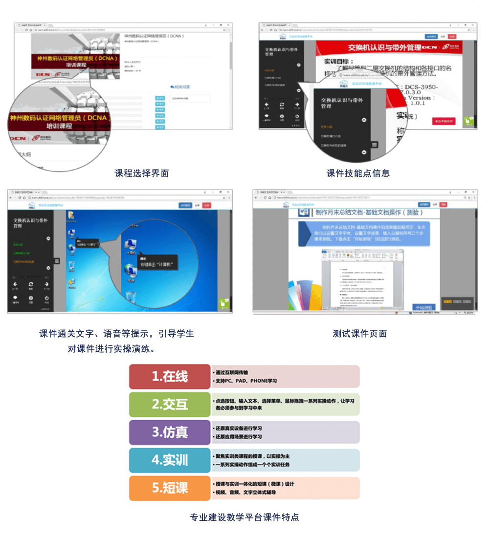 DCTP-50以先进的应用仿真技术开发多种岗位业务场景的仿真环境,以课件资源的形式搭载到实训云平台上。将多媒体技术和引导式仿真技术结合,改进课程教学模式,体现网路课程资源的广泛性、参与性与共享性,突出实训课程的互动实操性。